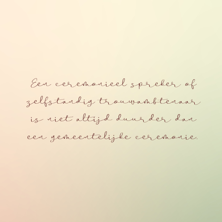Veel stellen melden hun huwelijk aan bij de gemeente en kiezen voor een BABS die verbonden is aan een gemeente. Niet iedereen is op de hoogte van de mogelijkheden van een zelfstandig trouwambtenaar of een ceremonieel spreker. Onlangs publiceerde The Perfect Wedding cijfers over de kosten van een gemeentelijk huwelijk. Hieruit blijkt dat de prijzen voor een huwelijk in het gemeentehuis doordeweeks in 2024 met 5,3% zijn gestegen ten opzichte van 2023. Op vrijdagen en in het weekend zijn de tarieven vaak nog hoger.